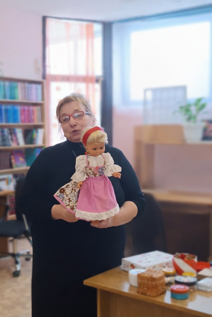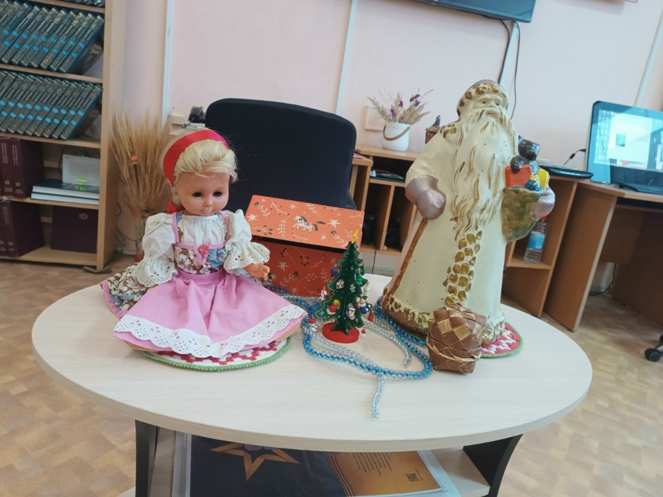 Ольга Анатольевна начала встречу с демонстрации редких экспонатов своей коллекции: Деда Мороза начала 50-х годов, переданного ей бабушкой, и очаровательной Снегурочки - куклы из своего детства. Эти раритеты стали отправной точкой для рассказа об истории появления первых советских новогодних игрушек.