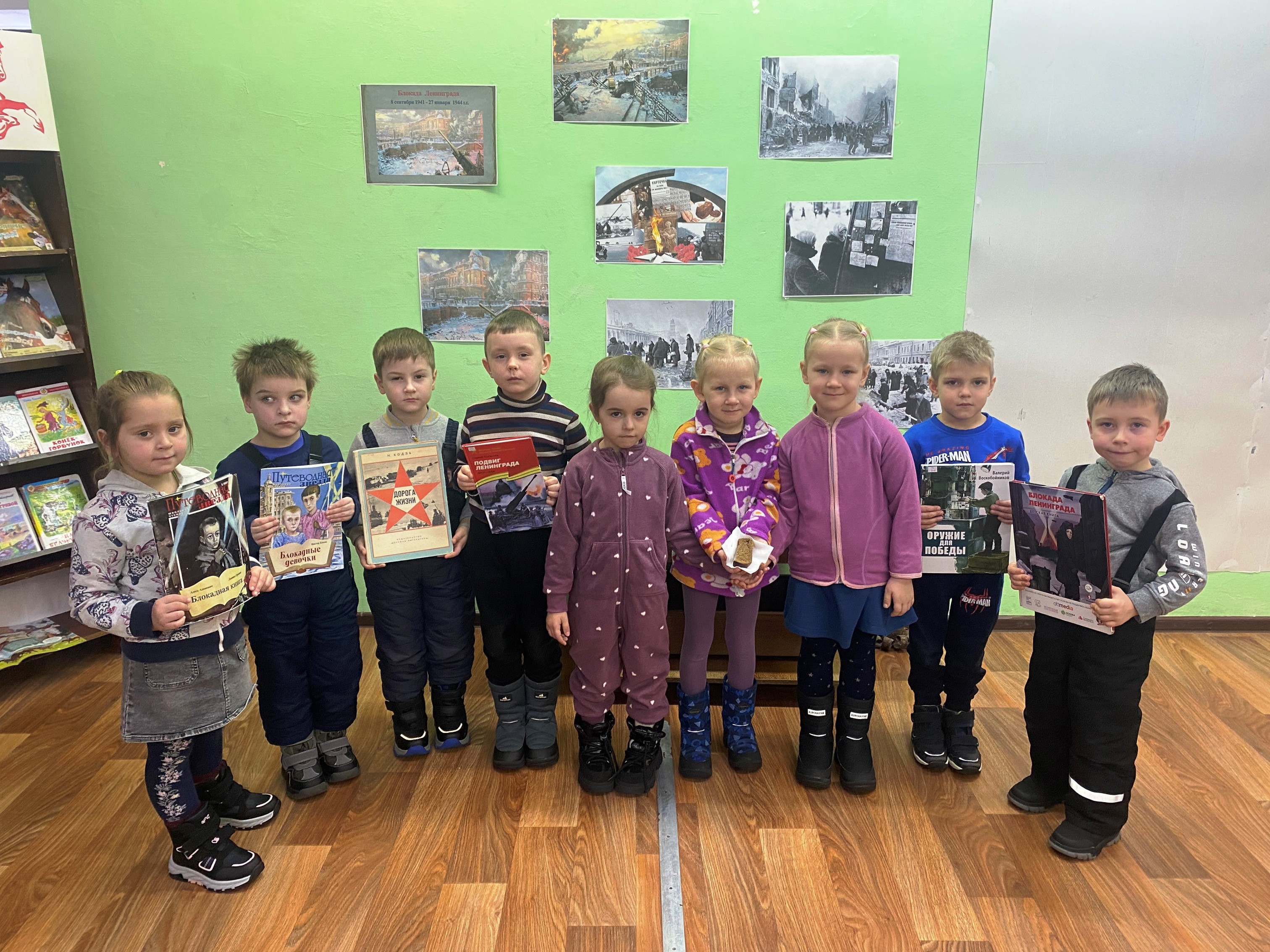Для детей дошкольного возраста были проведены громкие чтения «Была блокада – помнить надо!». Ребята познакомились с рассказами авторов книг, отразивших в своих произведениях атмосферу военного Ленинграда, оказавшегося в блокаде на целых 900 дней. Для чтения вслух были выбраны рассказы С. Алексеева «Первая колонна», в которых рассказывается о дорожно-автомобильной магистрали, названной ленинградцами «Дорогой жизни». Из рассказа «Блокадных лет» ребята узнали, что детям на весь день выдавали 125 грамм, которые и на хлеб-то не были похожи. В произведении Г. Черкашина «Кукла» наглядно описаны все тяготы, с которыми столкнулись ленинградцы. Юные читатели узнали о печке-буржуйке, которая стояла в каждом блокадном доме и была единственным источником тепла, пока ее топишь. О том, как страшно было ходить за водой на набережную Невы и, поскользнувшись, потерять бидончик, оставив всю семью без глотка воды.
